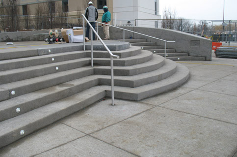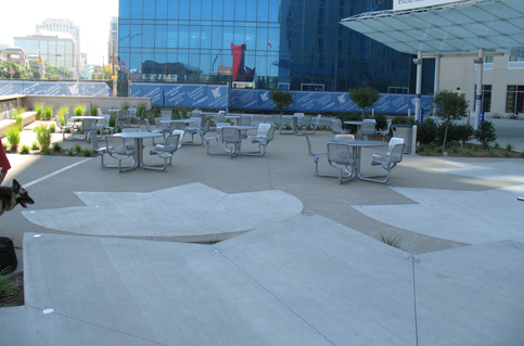 The hardscape in this small area is a sight to behold. Intergrally colored concrete with an exposed Sand Matrix Finish gives this plaza a high quality finish, fitting its illustrious surroundings as a premiere hotel in this bustling downtown location. Monstrous foundations and a large amount of utilities servicing 4 area hotels are hidden beneath this exquisite plaza. Custom formed walls and intricate stairs, all with embedded lights, elegantly carry out the plaza’s “Proud to be a Hoosier” theme.