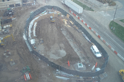 The construction of this project was completed in a 6 month period, alongside multiple larger scoped projects. Because the art plaza is to be a showpiece of the 4 hotels, owners and designers asked that it be constructed behind black drapes to obstruct the public’s view of the space before the project’s unveiling. With the project’s proximity to a major thoroughfare (Washington Street) out of the downtown area and the bustling jobsites surrounding the project, staging of materials and scheduling of delivery (both of materials and concrete trucks) were essential.