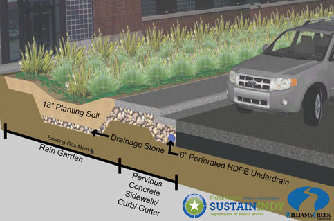 The project included a $5,000 grant from United Water to Indianapolis Downtown Inc. for the construction of the rain garden. The remainder of the project was funded through countywide stormwater budget. 100% of the project was completed by local designers and contractors. Williams Creek Consulting provided sustainable site engineering and landscape architecture services for the design and implementation of the GI elements.