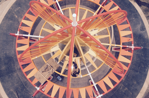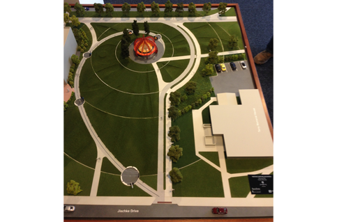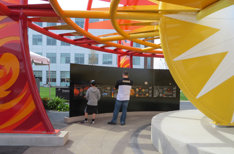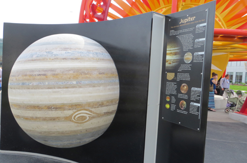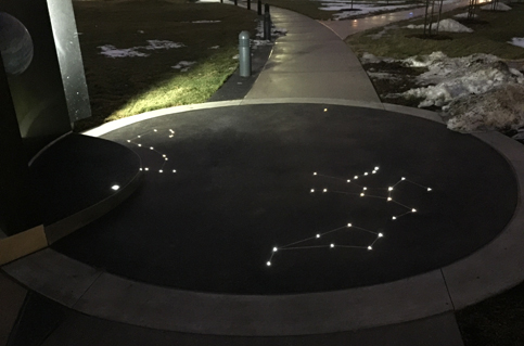 The project is a 2 acre site on Purdue’s campus, anchored by a sun sculpture that measures over 35’ high and over 40’ across. Curved planet walls surround the sun throughout the plaza, carrying planets that are scaled to the size of the sun. The planet walls are arranged on orbital paths that are also scaled (on a different scale, relative to each other) to their real-life counterparts.